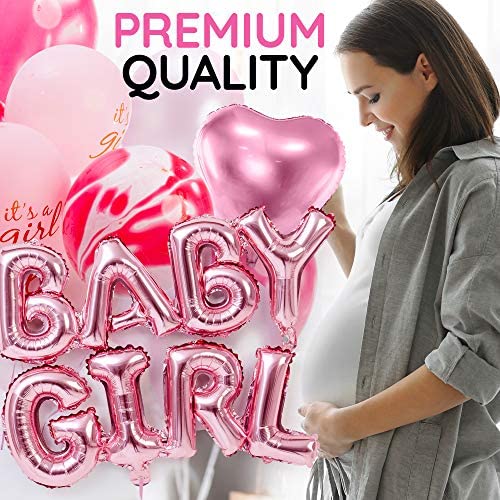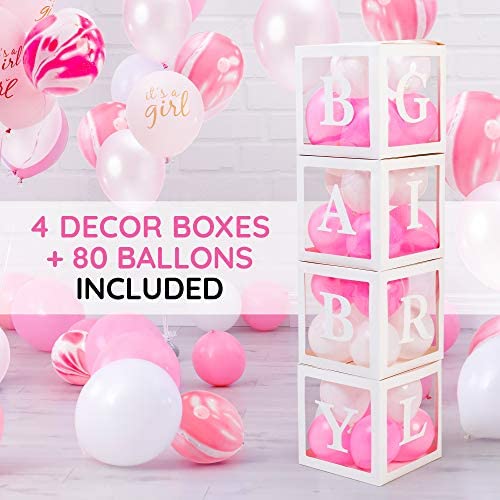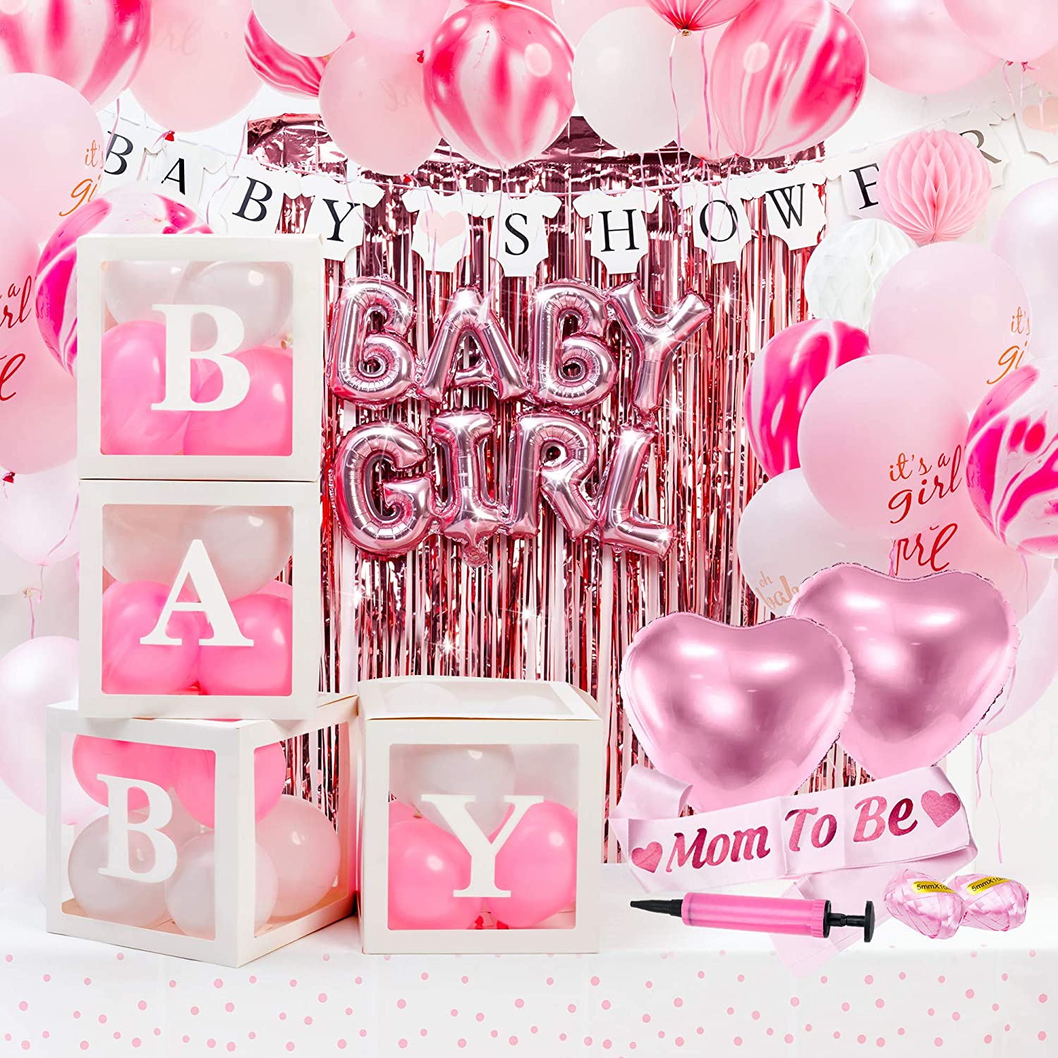 Its A New Baby Girl, And Her Baby Girl Shower Get Together Should Be As Fabulous As She Is!We are here to save you time and energy, by bringing together a bundle of items for the perfect baby girl shower decoration ideas! In our package you will find:80 Fun Latex Balloons! 40 5-sized Balloons in pink and white color, and 40 12-sized Balloons in Marble, White, and Pink color-the latter also include 5 Oh Baby and 5 Its A Girl Balloons!2 Light Pink Heart-Shaped Foil BalloonsOne Big BABY GIRL Foil Balloon Set! Two light pink foil balloons, one reading Baby, one reading Girl, with each words letters connected4 Wonderful Honeycomb Lanterns! 4 White Decor Boxes! Ideal for putting a few balloons in them, but can also be filled with confetti, glitter, or anything else you want! 16 Peel & Stick Letters! Spell Baby Girl two times; on the Decor Boxes, on a wall Up to you!One Backdrop & One Tablecloth! The rose gold backdrop is a Peel & Stick one, while the white and pink tablecloth is the ideal choice for your delicacies table!One Mom To Be Sash! One BABY SHOWER Banner! Comes to you pre-strung and ready to be hanged!4 Extra Handy Accessories! For convenience, our set includes; a balloon pump, a tape roll to help you secure banners, a glue dot roll to seal the décor boxes, make them sturdy, secure the letters or even hang the balloons, and two light pink string rolls to put up your balloons, throw around as ribbons, or any other need that may come up!What Are You Waiting For The Baby Girl Princess Is On Her Way!