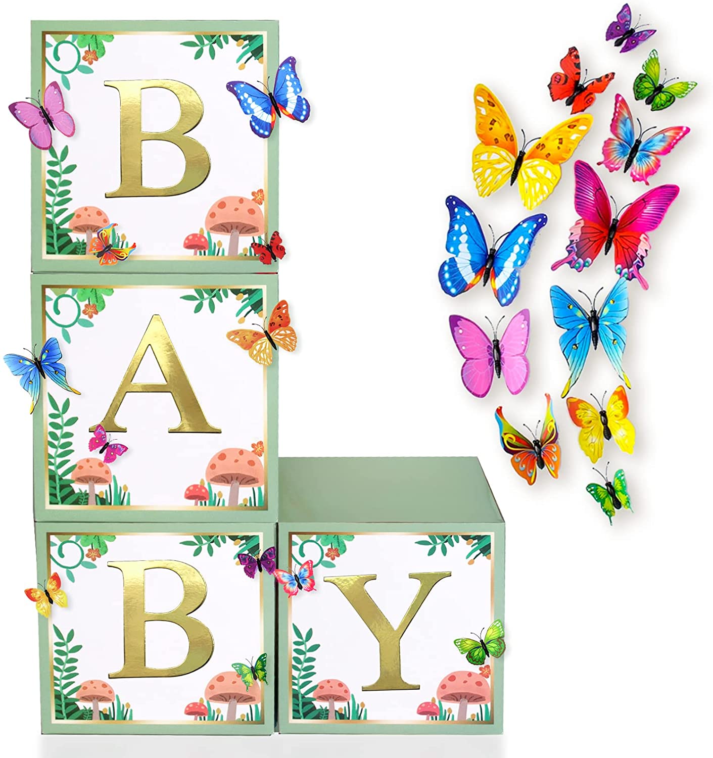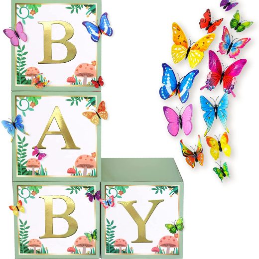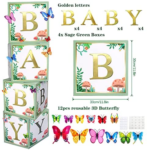 Big hit at baby shower partyGreen Baby Blocks Decorations Kit Including 4 pcs Sage Green Baby Block 12 x 12 x 12 Green Baby Boxes, 4 set(16pcs) of Letter “B” “A” “B” “Y”, 12pcs 3D Butterfly,40pcs Glue Dots, Perfect for Gender Reveal, 1st Birthday Girl Boy Decoration, and Any Baby Themed Parties, Baptism Decorations. The Best Choice to Decor Your Front Door or Baby Shower Gift Table, and Shower Backdrop. Easy to assembleBaby Shower Boxes are Pre-folded in Package, Takes Few Minutes to Assemble as Our Picture Instructions Shows, Paste BABY and Butterfly on The Box with Glue Included. It Has Never Been so Easy to Create a Festive Setup Indoors or Outdoors, Backyard Party or Baby Shower Party in the Park. DIY your baby shower partySage Green Baby Shower Decorations Come with 12pcs 3D Butterfly to Give You More Decoration Possibility, You Can Apply in Many Occasions, You Can Use Your Little Girls Boys Photos, Birthday Bear, Candys,Chocolates, Sage Green Balloons ect to Decor Your Baby Theme Party. Premium & Recyclable Baby Boxes are Made of Thick Cardboard Certified and Thoroughly Tested, Harmless to Pregnant Moms and Kids, It Can Stay in Good Shape During All Day. Both Baby Shower Blocks And 3D Butterfly are Reusable and Very Easy to Storage for Next Shower Party. Satisfaction GuaranteedContact us for a Full Refund. If You Are Unsatisfied About This Purchase. We Wish You and Your Family Have a Nice Celebration.