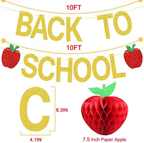 Back To School Banner Gold Glitter -Back to School Party Decorations Supplies -First Day of School Banner | Honeycomb Tissue Paper Apple Hanging Decorations -School Classroom Office Hanging Decor Sign