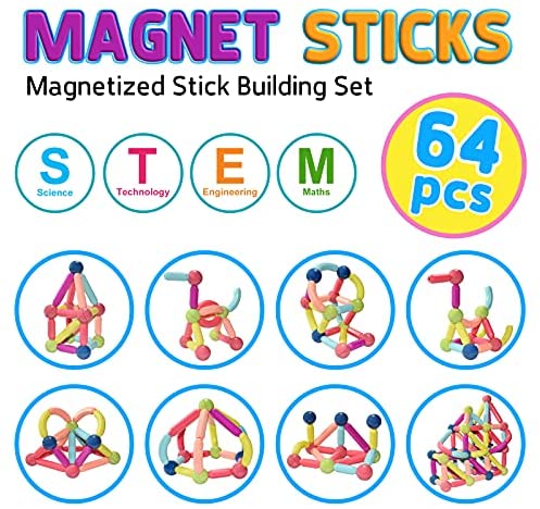 MAGNETIC BALLS & STICKS: This STEM learning toy is an open-ended magnetic construction toy for all age children. They will love this magnet block with endless variations. Let your kids’ imagination run wild and create their own works! DEVELOP CREATIVITY & CONFIDENCE: The colorful magnetic blocks helps your children to recognize basic colors and shapes, promote their creativity, symbolic thinking, and problem solving ability while they have fun. SPECIAL DESIGN & EASY TO PLAY: Come with 64 magnetic sticks in a variety of shapes provide kids endless possibility to create different models. They can build many 2D and 3D models according their own imagination. NON-TOXIC & HIGH QUALITY: Made of high quality ABS plastic and permanent magnets, easy to connect and disconnect. The smooth surface will not hurt your baby’s delicate skin. It is a durable use construction toy. ENJOY YOUR FAMILY TIME: Suitable for girls, boys, and toddlers, it is a perfect choice for parent-child interaction, kids will willing to complete their work under your help. It’s also a great classroom educational toy for teacher in school or kindergarten.