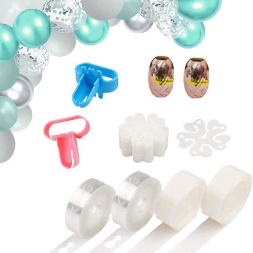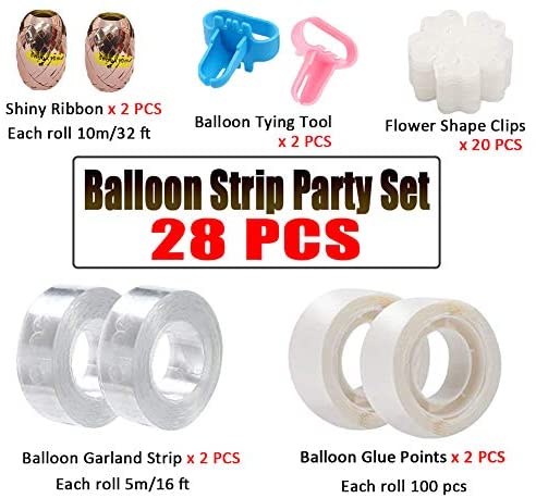 Balloon Arch Garland Strip Decorating Kit, 28 PCS 32ft Balloon Tape Strip 20PCS Flower Shape Clips 200 Point Glue 2PCS Balloons Tying Tool 64ft Metallic Ribbon for Birthday Party Supplies