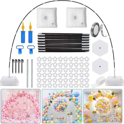 Easy To Disassemle&Store: Only 5 Min, The outer box box has a very reasonable design, Also it take minimum effort and time to disassemble this balloon arch and store it in small places. High Quality: Sturdy mesh base and water bag, stable metal pipe.It will not shake sharply due to wind or object collision.The balloon pole is a folded integral accessory, black glass fiber pole, bending is not easy to break. Wide Applications: The bolloon arch kit can be used for any large or small celebration, such as birthday party, family parties, Christmas and Halloween, wedding and baby showers and so on. Package Includes : Balloons arch kit package includes 15 Folded Glass Fiber Pole,2 PVC Base,2 metal long pipe,1 Dot Glue, 2 water(sand) fillable bag,1 manual pump, 50 balloon clips,2 balloon knotter,4 ground nails. After-Sale Guarantee: Whenever you need help on DIY steps,pls contact us by email , if you have any quality questions,Please tell us.