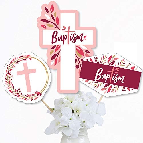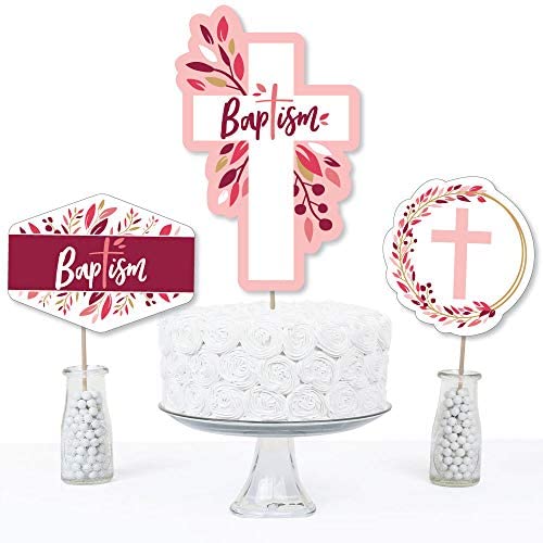 Baptism Pink Elegant Cross Centerpiece Sticks INCLUDES 15 girl table toppers in three different shapes, 15 wooden dowel sticks and stickers for easy assembly. Girl baby dedication party table decorations are perfect for a girl religious party. Baptism Pink Elegant Cross Centerpiece Sticks SIZE five cross table toppers, 7” wide x 10.75” tall; five baptism table toppers, 7” wide x 5” tall; and five circle table toppers, 5.75” wide x 6” tall. The unique design and variety of pieces makes this table decoration kit an impressive addition to any cross theme party. EASY PARTY DECOR: Baptism Pink Elegant Cross table decorations can be used as centerpieces when attached to the included dowels and inserted into vases or floral arrangements. They easily accent your girl religious party candy buffet when you add them to apothecary jars. Table toppers are also a great addition to any photo booth. The large shaped cut outs will make your party pics instantly shareable. PREMIUM PARTY SUPPLIES: Baptism Pink Elegant Cross table toppers are professionally printed on heavy-duty cardstock paper with a photo-like shine. They are individually inspected and carefully packaged by hand with wooden dowels and stickers for easy assembly. Get creative with your DIY party ideas! MADE IN THE USA: Baptism Pink Elegant Cross – Girl Religious Party Centerpiece Sticks are designed and manufactured at our Wisconsin facility using materials that are Made in America.