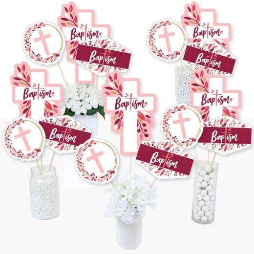 Baptism Pink Elegant Cross – Girl Religious Party Centerpiece Sticks – Table Toppers – Set of 15