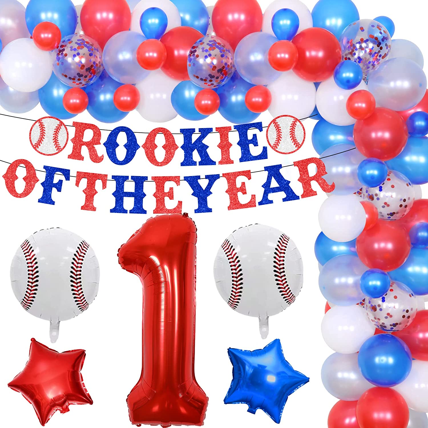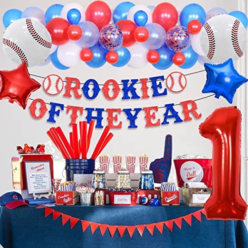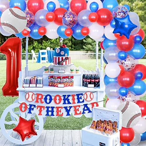 Baseball 1st Birthday Decorations Red White and Blue Balloon Garland Kit Rookie of The Year Banner for Boys Baseball Sports Themed First Bday Party Supplies