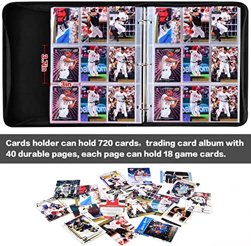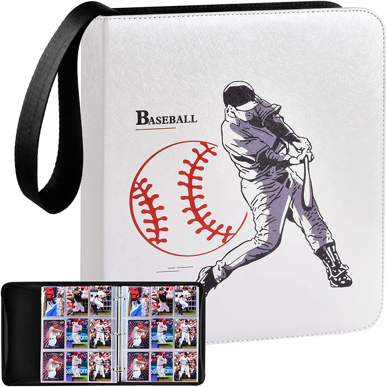 Large capacity for baseball cards binder: Baseball card book with 40 pages, each page holds 18 cards (9-pocket, front and back). Totally can hold 720pcs baseball football basketball sports cards. Fit for Pokémon and for YuGiOh cards/ for pokemon TCG/ for Topps 2021/ for nfl football/ for Monopoly Deal/ Bicycle/ for LotFancy Playing Cards/ for SKYJO/ for Cards Against Humanity/ for Unstable Unicorns Base Game/ for Dutch Blitz Card Game and more card games. External size: 13*11.25*2 inches. Unique design with baseball card display case: Baseball card holder with strong 3-ring design for you to add more baseball card sleeves, soft and durable materials sleeves allows you easy to put cards in and out, Stander pocket fits for all game cards/ for phase 10/ for Exploding Kittens and more. High Transparent design easy for displaying cards with your friends without taking out, and protect for topps 2021 baseball cards not fade and keep new. Pockets size: 3.7*3 inches. Premium material of sports card collection holder: Football card binder is made of hard material with soft PU leather cover, which is good waterproof and free of dirt. fashionable baseball pattern design match the baseball cards, exquisite stitching and double sutures make baseball card album more durable. Sturdy zipper closure for baseball cards 2021 with sleeves protecting for topps baseball cards in all directions, without worrying about getting bent or falling down. Baseball binders for cards easy to display: Baseball card protectors with compact size and high-quality material make it comfortable to place on shelf. Durable handle strap of this trading card binder is easy for you to carrying it to school or traveling.You can show your cherished cards with the baseball holder to your friends everywhere and fully enjoy the fun of collecting together. Baseball card binder with sleeves as a birthday and Christmas rewards: If someone likes to collect different kinds of cards, then you can buy this card storage box for him. I believe he will feel happy to receive this baseball card organizer. If you have a child, you can also buy this card collector holders for him and help him build up a good collecting hobby, teach him all kinds of baseball knowledge, and discuss baseball games together.