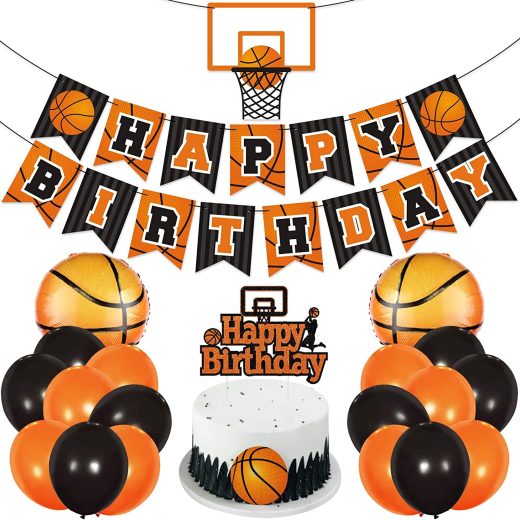 Latex Coolest Sports Birthday Party Favors PackPackage contents 22 latex balloons (orange, black),2 giant foil basketball balloons, basketball happy birthday banner in 3pcs and 1 happy birhtday cake topper.Its awesome designs and colors will definitely light up your birthday party. Pre-assembled Banner & Cake TopperBanner and cake topper are made of quality-thick paper cardstock. Each banner is approximately 4.5 feet long and can be hung securely over party entrances, dessert tables, walls, windows, etc. The cake topper is 8.7 inches high and 6.7 inches wide, making it a perfect centerpiece for any cake or dessert table. Accessible Design To All Basketball LoversBasketball theme is always a great sports theme party idea to have the party indoors,outdoors, in your backyard, household, at a local park, and school gym.And these birthday party set will be a great finishing touch for all basketball lovers. Throw A Slam Dunk Party for Your MVP!Its time to eat, sleep and dunk.There is nothing but net on a basketball party. This birthday kit is perfect for basketball fans who have birthdays in March Madness, NBA, high school, elementary school, college basketball games, and spring break. Basketball Birthday Party Decoration Kits WarrantyIf you are not satisfied with the product, we will provide a refund or replacement guarantee. Please feel free to contact us if you have any issues or advice.