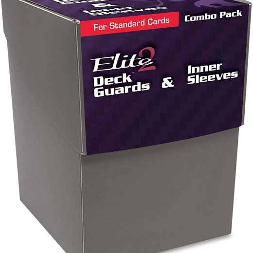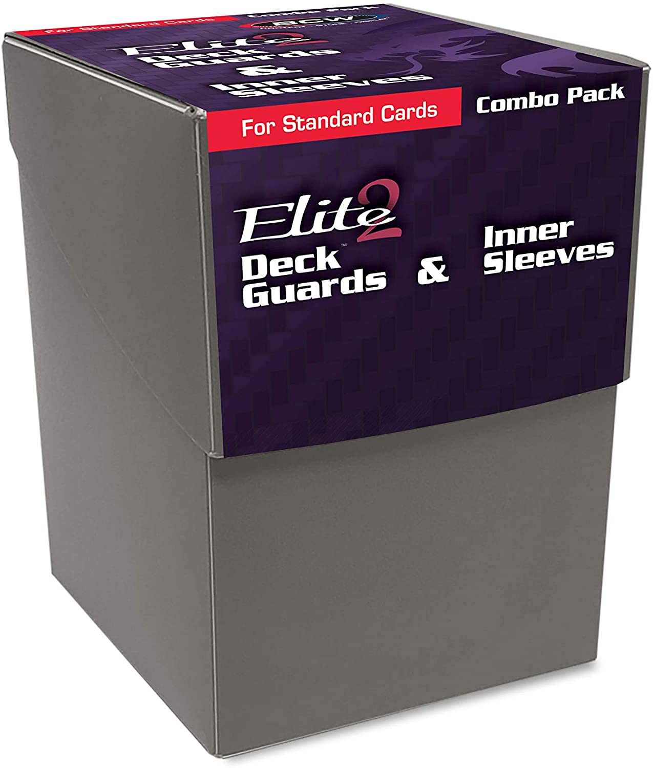 BCW has combined some popular sleeves to make a great value for gamers that double-sleeve their cards. These Combo Packs packs include 100 Elite2 Deck Guards and 100 inner sleeves, packaged in a plastic deck case with a card divider. Elite2 Deck Guards are BCWs premium game card sleeves, and the ones used in the Combo Packs are for standard-size cards. They have a gloss finish on the clear layer to maintain the shine of foil cards. Elite2 Deck Guards have a blackout layer to ensure the sleeves are opaque.