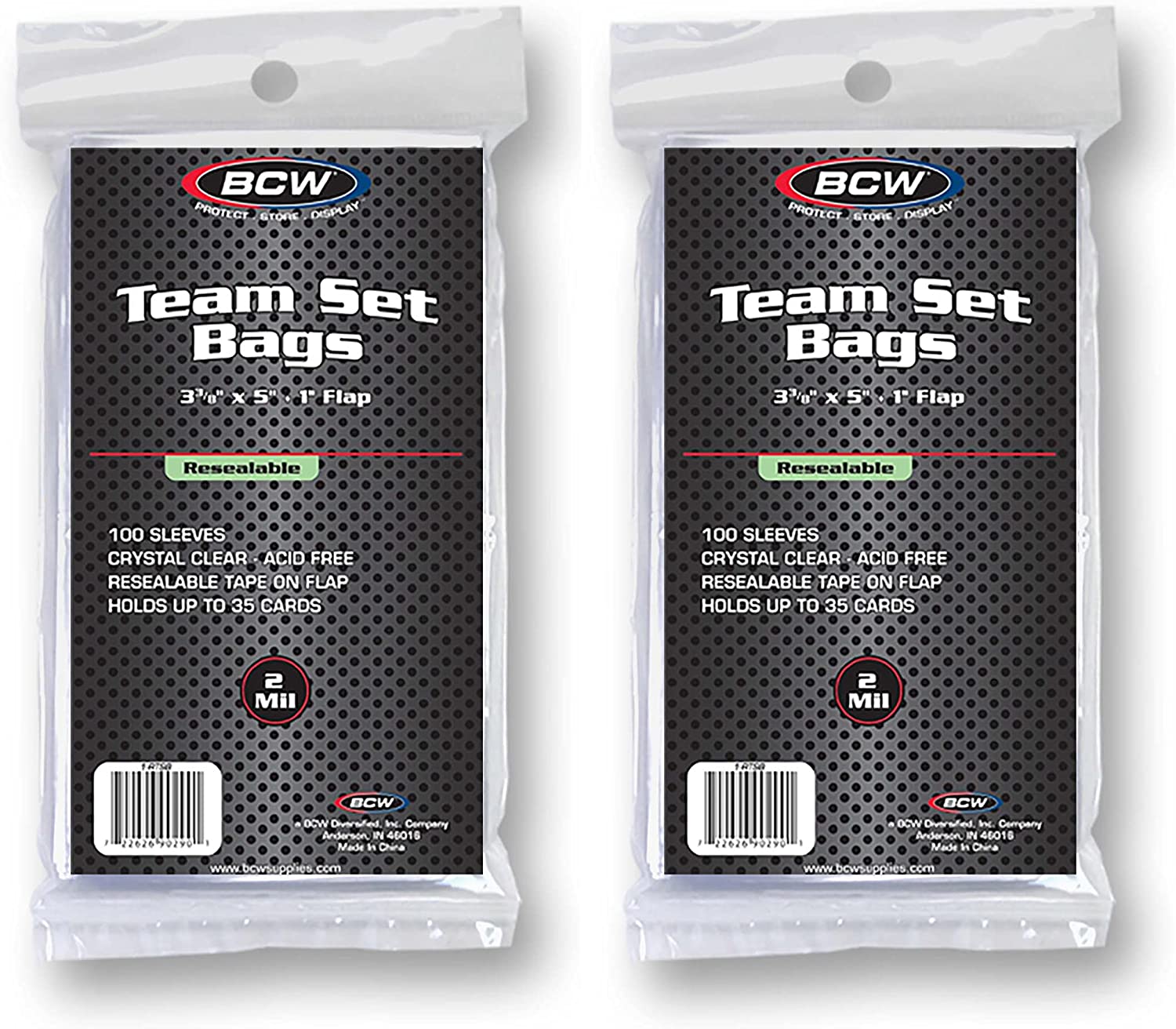 BCW Resealable Team Set Bags are an acid free, archival quality product made of crystal clear polypropylene and have an adhesive strip on the lip. BCW Team Set Bags hold approximately 35 standard cards. These also work great to enclose toploaders and magnetics to ensure the cards stay in the holders. Team Set Bags hold all thicknesses of standard toploaders, and magnetic card holders up to 180 points.