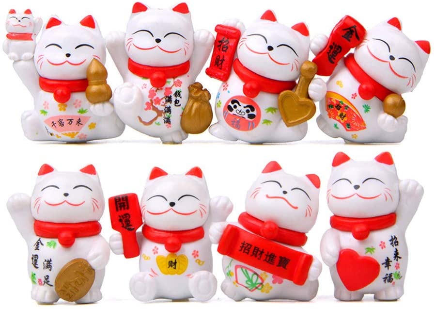 Beauy Girl 8 Pcs Cute Lucky Cat Figures, Animal Cat Characters Toys Mini Figure Collection Playset, Cat Toys Set Cake Toppers, Plant, Automobile Decoration, Landscape Scenes