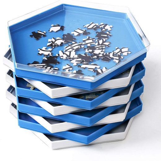 Premium Material – Becko puzzle sorting trays are constructed by premium ABS, sturdy and durable. Comes with 8 trays in white and blue, better for sorting puzzles of different colors. It is an indispensable piece of equipment for puzzle enthusiasts. Perfect Size For Easy Sorting – Each tray measures 9.4 x 8.2 x 0.7 in. Just spread out the puzzle pieces by color, pattern or shape and place them the trays respectively, the game will be much easier. Bonus Lid – Enclosed with a transparent lid that serves as a good helping hand to protect jigsaw puzzles against your naughty pets and dust. No worrying of knock everything over. Stackable Design – The cute hexagonal trays can be stacked up easily for compact organization. Place the lid on the topmost tray and put them into the colored box for space-saving storage and transportation for puzzle pieces. Package Content – White sorting tray x 4, blue sorting tray x 4, transparent lid x 1.