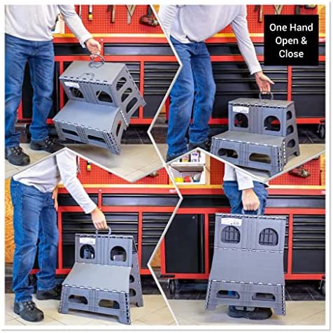 One Hand Open & Close – Our Step Stool is easy to fold & allows you to open or close with minimal effort using a single hand Prevents Wobble – Bee Neat folding step stool supports up to 300lbs. Our patented sturdy design has been constructed to improve your stability when trying to get to those hard to reach places Easy to Carry – Our 2-step folding stool just not only weigh 5.75lbs but it’s also just 1.5” thick when folded, you can easily carry it around during long trips inside your RV or simply store it under sofa or bed when not in use Gives You Extra Boost – With a height of 17.5”, it helps you in giving extra boost to reach the top of your kitchen cabinet, pantry and closet. Provides you a stable platform to do cleaning, painting and much more! Satisfaction Guarantee – If there is an issue with your order or you are not satisfied with the product, simply contact us and our 24 / 7 support team will be ready to find a solution for you ASAP