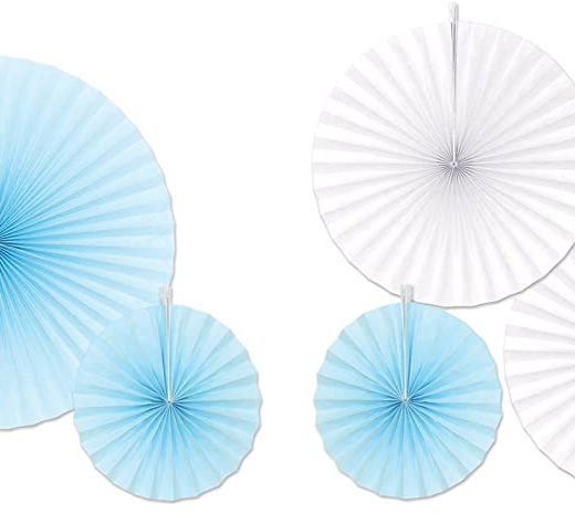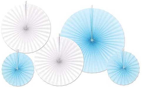 Beistle 53324 Accordion paper fans. The package contains 10 assorted Accordion fans. In the package, you will receive four 8 inch light Blue fans, four 12 inch white fans and two 16 inch light Blue fans. They are all made of paper. The fans are flat in the package and will have to be opened up. These colorful fans are great hanging decorations for a baby shower or for the winter season!