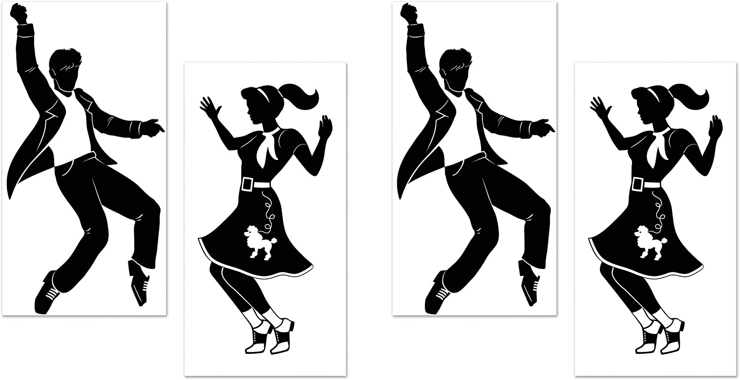 Beistle 59916 Rock and Roll Props. The package contains 4 pieces of rock and roll props – 2 female and 2 male. They are printed on thin plastic that is meant to be cut out and taped to the wall for decoration. The male ones measure 5 feet 3 inches tall and the female ones measure 4 feet 8 inches tall. Put them on walls to decorate for a rock and roll themed party!.