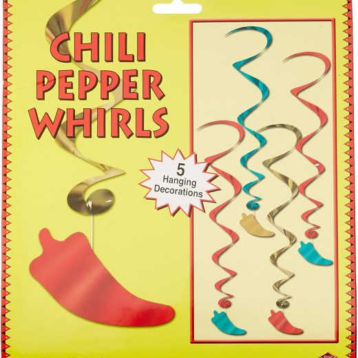 Beistle 57519 Chili Pepper Whirls (5 Count). These chili pepper whirls have assorted gold, green, or red metallic spirals with a chili pepper at the bottom. They measure 3 feet long and would be great decorations at any fiesta or Cinco de Mayo celebration!.