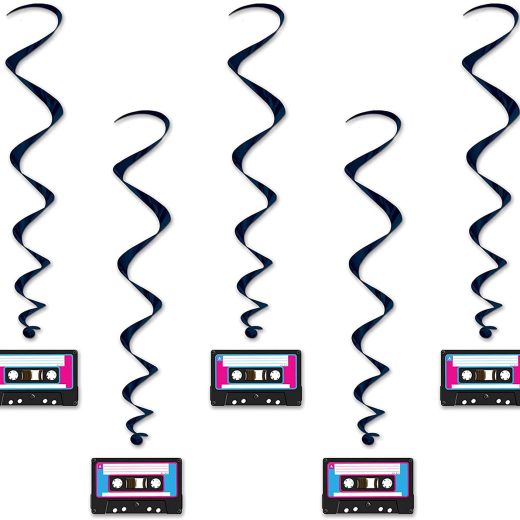 The package includes 5 pieces of Cassette Tape Whirls. The whirls are made of black metallic spirals with printed board stock cassette tapes attached at the bottom. They are 3 feet 3 Inch long. Decorate for an 80s themed party with these great whirls.