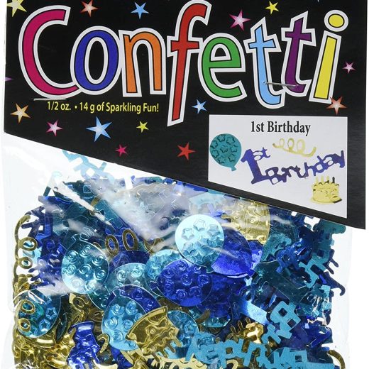 Beistle CN059 1st Birthday Confetti. These are small pieces of confetti in shapes of balloons, cakes, serpentines and 1st Birthday. The colors are shades of blues and gold. Decorate the tables with this awesome confetti for a boys 1st birthday party!.