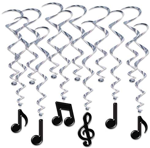 Bristle 53409 musical notes whirls. Includes 24 pieces in package. These whirls measure between 17. 5 inches to 32 inches tall. They are made of metallic spirals, 12 with printed board stock paper icons and 12 without icons. Hang them up to decorate your musical themed event!