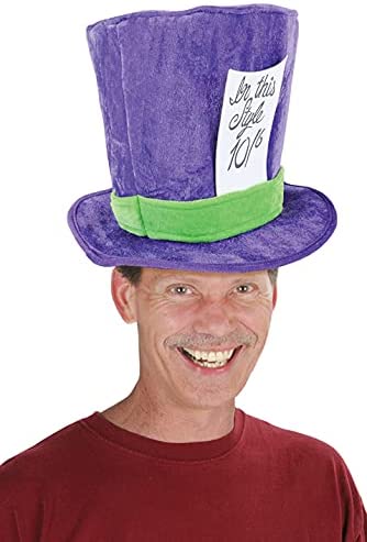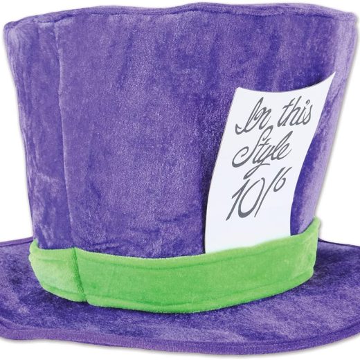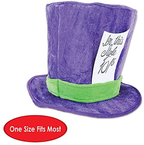 Beistle 60059 plush mad Hatter hat. The package contains 1 hat. This plush fabric hat is Purple with a Lime Green band around it. There is a white Sign attached to the side of the hat that says in this style 10/6. one size fits most. Wear this hat for an Alice in Wonderland themed party! will also work as an accessory for a Halloween costume!