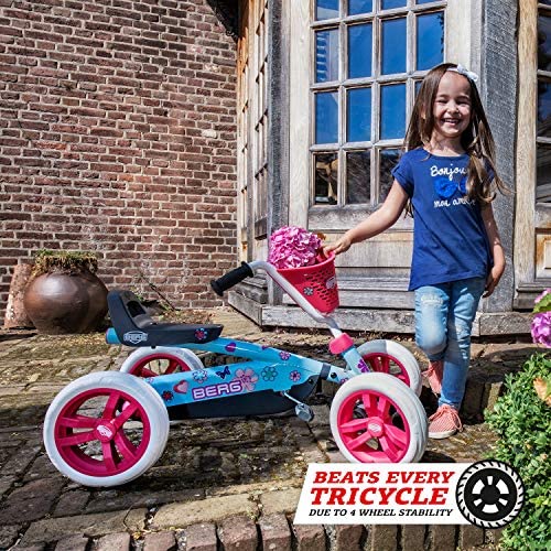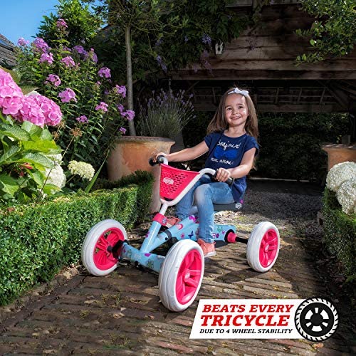 Thanks to its four wheels, the BERG Buzzy has excellent stability. Because tricycles have one wheel less, they are far less stable. The centre of gravity of a tricycle is close to the tilt line, the line between the front and the rear wheels. Riding sharply or fast around corners on a tricycle can easily cause it to tip over, along with its passenger. Because the Buzzy has four wheels the tilt line is much further outwards and further away from the centre of gravity.