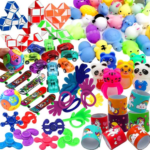 6 Unicorn Slap Bracelets, 6 Mochi Squishy Toys, 5 Sticky Hands, 5 Mini Tumbler Toys, 5 Finger Skateboards, 5 Pull Back Car, 4 Fidget Snake Twist Pu…