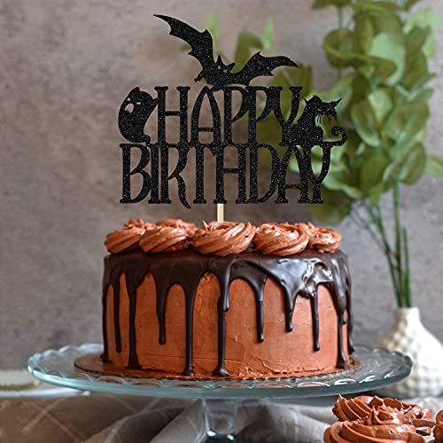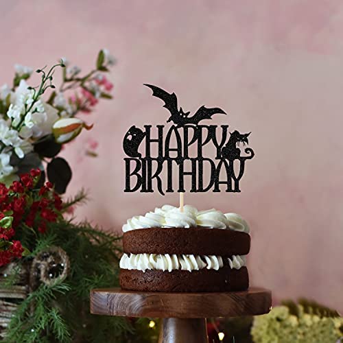 Betalala Halloween Happy Birthday Cake Topper, Halloween Birthday Decorations, Bat Birthday Decor, Halloween Themed Birthday Party Decoration Supply Black Glitter