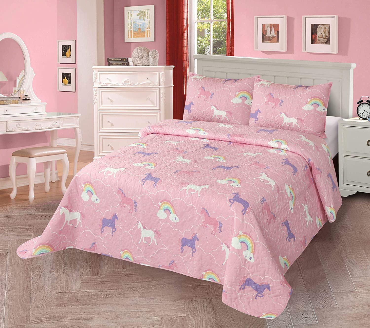 Better Home Style Multicolor Pink Purple White Unicorn Unicorns Rainbow Design Kids/ Girls /Toddler 3 Piece Coverlet Bedspread Quilt Set with 2 Shams # Rainbow Unicorn (Queen / Full)