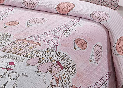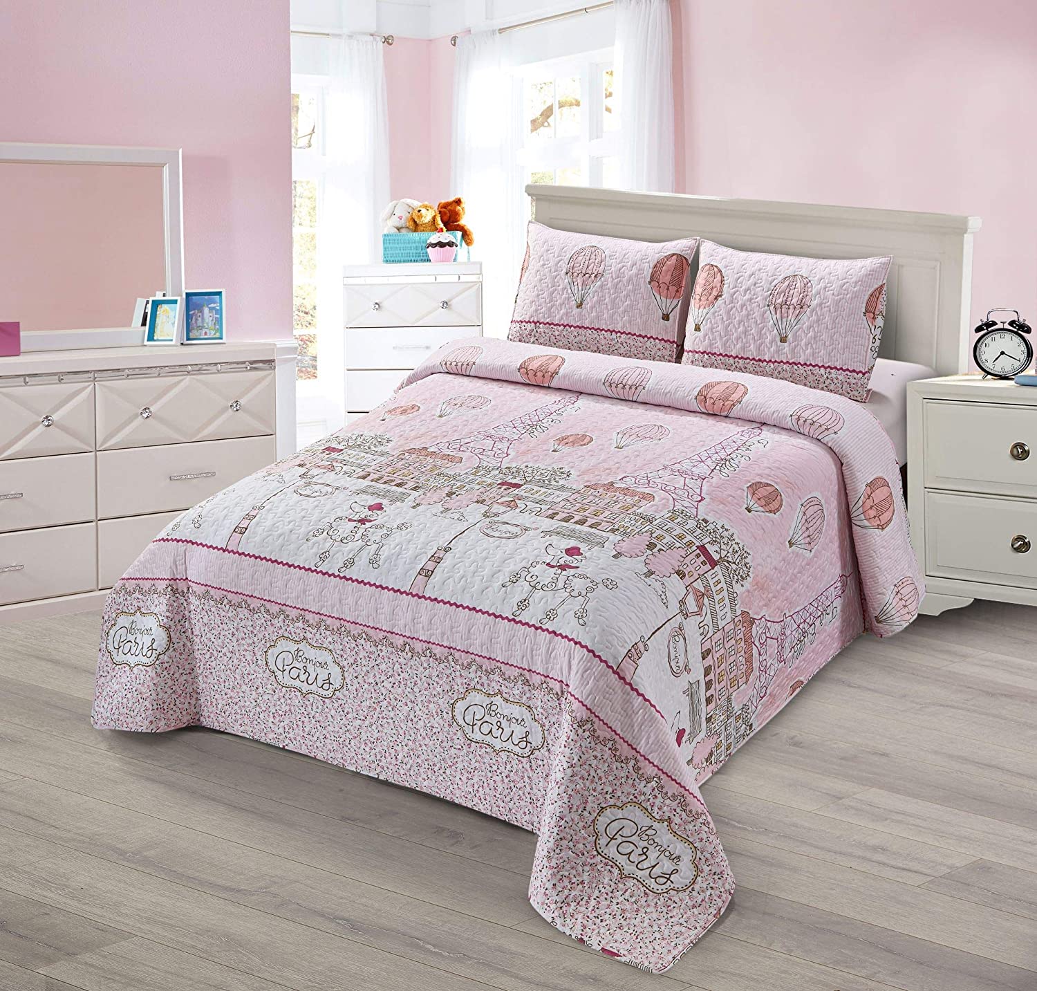 Better Home Style White Pink Paris Eiffel Tower with Trees Balloons Street Lights Dogs Design Bonjour Kids/ Girls /Toddler Coverlet Bedspread Quilt Set with Shams # LaLa (Queen / Full)
