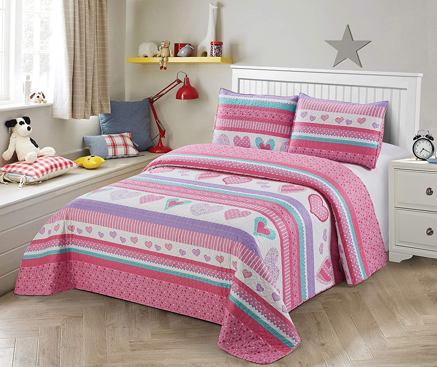 Better Home Style White Pink Purple Turquoise Hearts & Polka Dots Kids / Girls / Teens Coverlet Bedspread Quilt Set with Sham # Hearts (Twin)