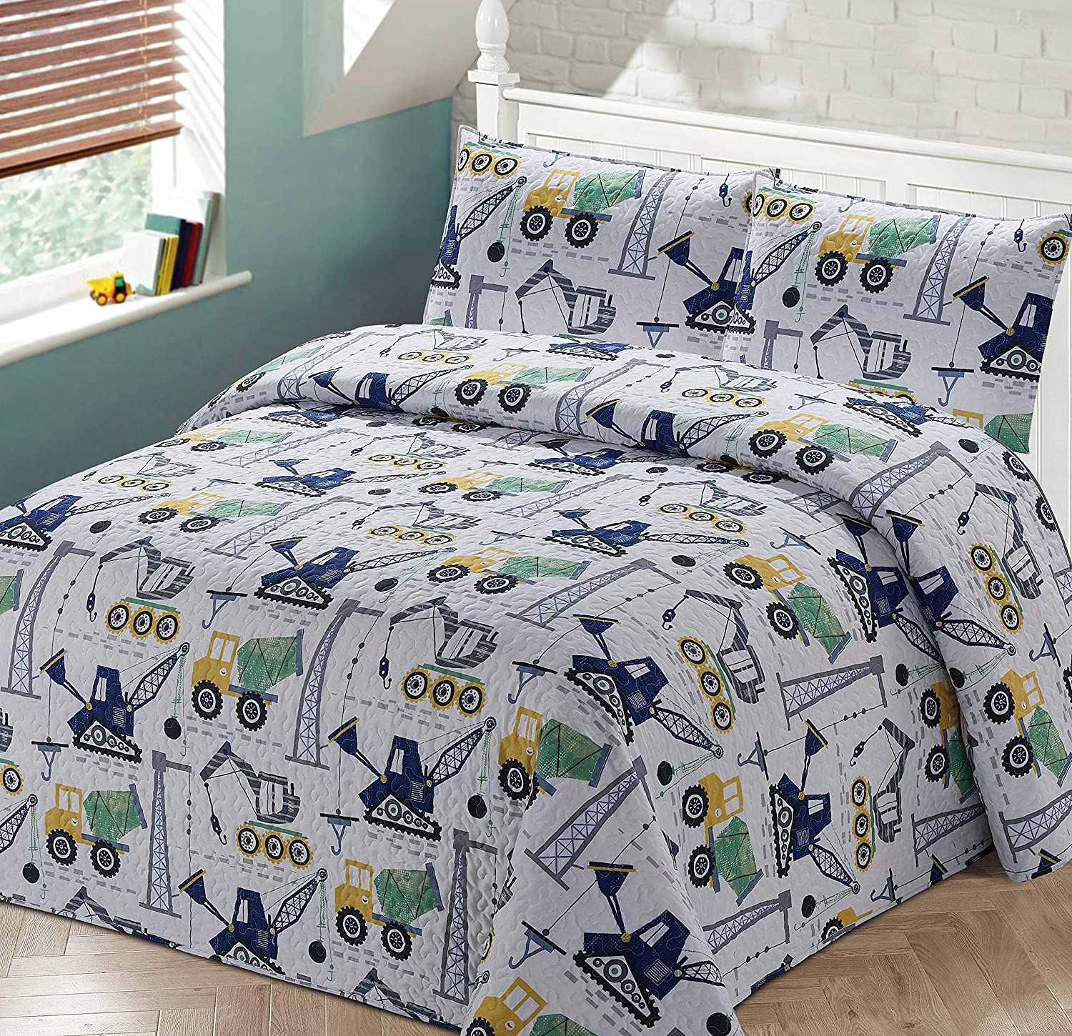 Better Home Style White Yellow Green Blue Construction Vehicles Kids / Boys Coverlet Bedspread Quilt Set with Pillowcases and Cement Mixers Cranes and Bulldozer Designs # Crane (Queen / Full)