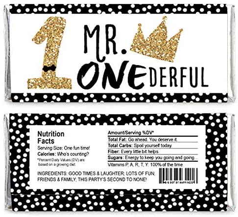 1st Birthday Little Mr. Onederful Standard Candy Bar Wrapper Kit INCLUDES 24 chocolate bar wrappers and 24 foils, perfect for styling an adorable black and gold candy buffet or unique boy birthday party favors. 1st Birthday Little Mr. Onederful candy bar wrappers MEASURE 5.25 inches wide x 6.25 inches high and will quickly add the 1st Birthday Little Mr. Onederful party theme to all your sweet treats. It is easy to wrap Hersheys standard sized candy bars with these boy first paper wrappers and foils! EASY PARTY DECORATIONS: Decorated 1st Birthday Little Mr. Onederful candy bars are an easy birthday party favor to gift all your guests. Set a decorated candy bar at each place setting, package in small gift bags as a party favor or display in a pretty bowl at your candy buffet. Get creative with your boy first DIY birthday party decoration ideas! PREMIUM PARTY SUPPLIES: 1st Birthday Little Mr. Onederful chocolate candy bar wrappers are professionally printed on premium grade paper with a photo-like shine. They are individually inspected and carefully packaged by hand with silver foil wraps. Follow the included instructions to quickly wrap a foil around each chocolate candy bar and then add the printed paper wrapper, securing with tape. MADE IN THE USA: 1st Birthday Little Mr. Onederful Candy Bar Wrapper Party Favors are designed and manufactured at our Wisconsin facility using materials that are Made in the USA. Please Note: Candy bars are not included but are available at your local grocery store. Candy bar wrappers will fit standard 1.55 oz chocolate bars. We use a No-Mess Glitter Print: Our party favors are designed with a printed image of glitter, eliminating glitter flake while maximizing bling effect!
