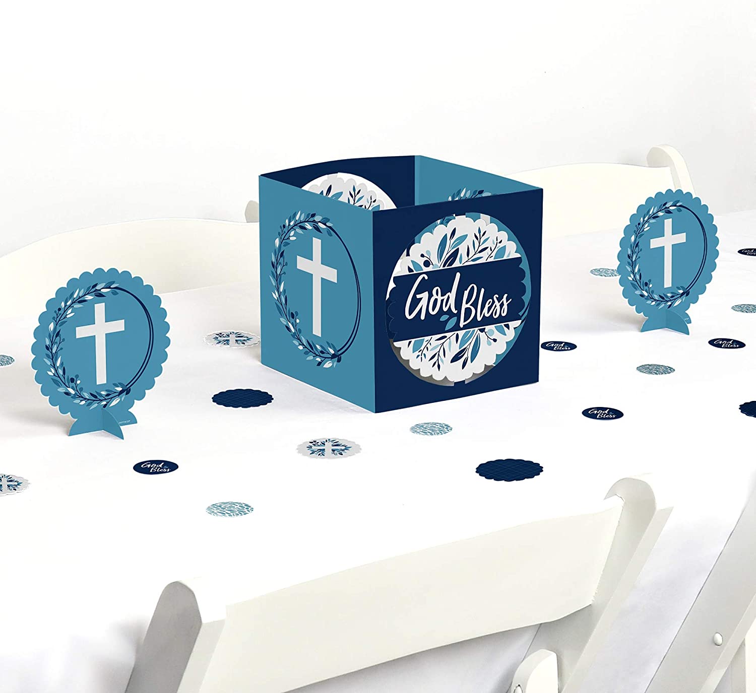 Blue Elegant Cross Table Decoration Kit INCLUDES 1 large baptism, Christening, First Communion, Confirmation or baby dedication party centerpiece, 2 scalloped centerpieces, 12 scalloped table confetti pieces and 24 round table confetti pieces. Blue Elegant Cross table decorations are perfect for a party. Blue Elegant Cross decoration kit SIZE 1 Accordion-Folded Centerpiece (may also be formed into a cube using the included stickers), 30 long x 7.5 tall; 2 Scalloped Centerpiece Stands, 5.5 wide x 5.75 tall; 12 Scalloped Table Confetti Circles, 2.5 diameter; and 24 Round Table Confetti Circles, 1.5 diameter. The unique design and variety of pieces makes this boy religious party decoration kit an impressive addition to any baptism, Christening, First Communion, Confirmation or baby dedication EASY TABLE DECOR: Blue Elegant Cross large centerpiece paired with the scalloped stands looks great down the length of a table or separated onto three different tables and accented with the confetti pieces. Get creative and use the table confetti for DIY party ideas, as well. Hole punch each scalloped circle and sting as a small banner, use as favor tags or add to candy jars. Boy cross centerpiece and decoration kit will make a statement however you choose to use them. PREMIUM PARTY SUPPLIES: Blue Elegant Cross centerpiece and table decor kit is professionally printed on heavy-duty cardstock paper with a photo-like shine. They are individually inspected and carefully packaged by hand. Centerpieces and table confetti will arrive flat. Get creative with your DIY party ideas! MADE IN THE USA: Blue Elegant Cross – Party Centerpiece & Table Decoration Kit is designed and manufactured at our Wisconsin facility using materials that are Made in America.