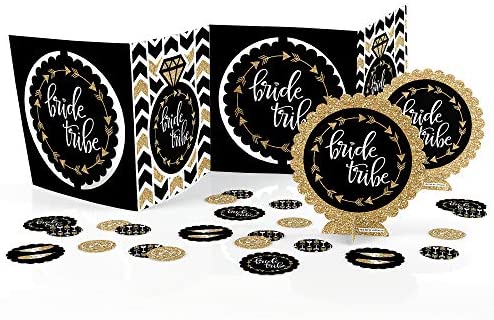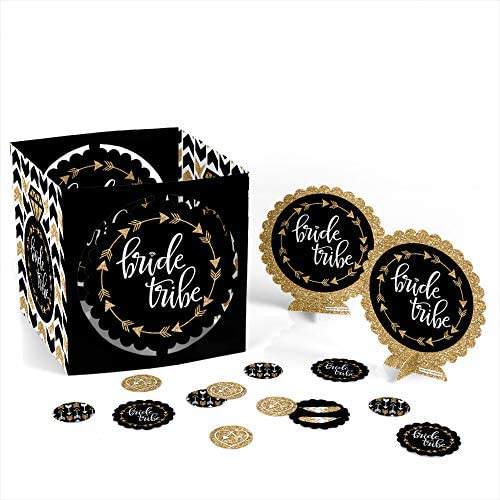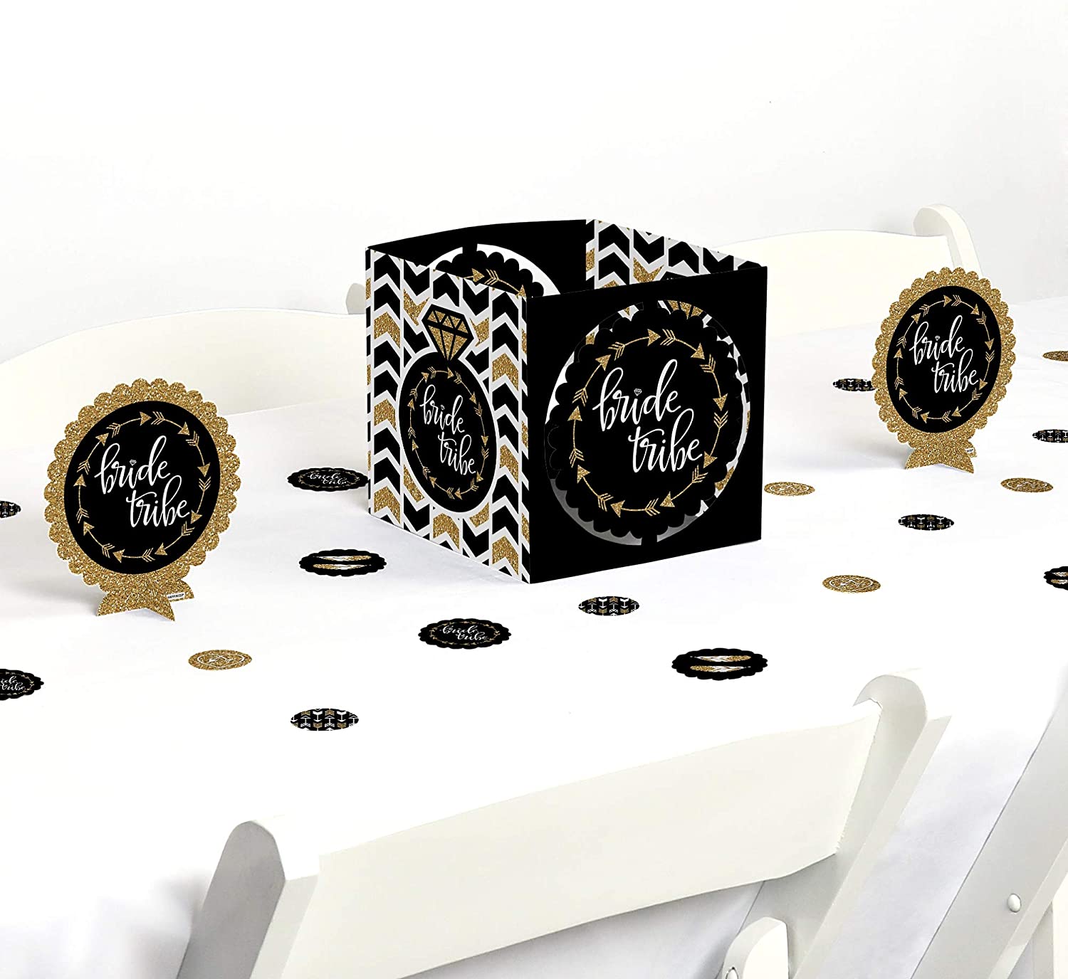 Bride Tribe Table Decoration Kit INCLUDES 1 large centerpiece, 2 scalloped centerpieces, 12 scalloped table confetti pieces and 24 round table confetti pieces. Bride Tribe party table decorations are perfect for a bridal shower or bachelorette party. Bride Tribe party decoration kit SIZE 1 Accordion-Folded Centerpiece (may also be formed into a cube using the included stickers), 30 long x 7.5 tall; 2 Scalloped Centerpiece Stands, 5.5 wide x 5.75 tall; 12 Scalloped Table Confetti Circles, 2.5 diameter; and 24 Round Table Confetti Circles, 1.5 diameter. The unique design and variety of pieces makes this aztec tribal party decoration kit an impressive addition to any bridal shower or bachelorette party. EASY TABLE DECOR: Bride Tribe large centerpiece paired with the scalloped stands looks great down the length of a table or separated onto three different tables and accented with the confetti pieces. Get creative and use the table confetti for DIY party ideas, as well. Hole punch each scalloped circle and sting as a small banner, use as favor tags or add to candy jars. Gold and black tribal themed centerpiece and decoration kit will make a statement however you choose to use them. PREMIUM PARTY SUPPLIES: Bride Tribe centerpiece and table decor kit is professionally printed on heavy-duty cardstock paper with a photo-like shine. They are individually inspected and carefully packaged by hand. Centerpieces and table confetti will arrive flat. Get creative with your DIY party ideas! MADE IN THE USA: Bride Tribe – Bridal Shower & Bachelorette Party Centerpiece & Table Decoration Kit is designed and manufactured at our Wisconsin facility using materials that are Made in America. Bride Tribe decoration kit uses a No-Mess Glitter Print: Our decor kit is designed with a printed image of glitter, eliminating glitter flake while maximizing bling effect!