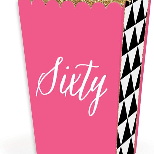 Chic 60th Birthday Favor Popcorn Treat Boxes INCLUDES 12 Chic 60th Birthday party favor boxes. Chic 60th Birthday treat boxes are perfect for any event. The pink, black and gold theme is great for a birthday party. Chic 60th Birthday party favor popcorn treat boxes SIZE 5.75 inches tall x 3.5 inches square at the top. The unique design and large size makes these 12 pink, black and gold popcorn boxes a must-have for any birthday party. POPCORN BOX PARTY SUPPLIES: Chic 60th Birthday popcorn boxes will hold a variety of party food. Fill them with sweet treats or salty snacks. Popcorn, caramel corn, candies and other goodies will look amazing on your candy buffet with these sixtieth favor boxes. PREMIUM PARTY FAVOR BOXES: Chic 60th Birthday party treat boxes are professionally printed on heavy-duty cardstock paper with a photo-like shine. They are hand-folded and individually inspected, then carefully packaged. Popcorn boxes will arrive flat. Easy assembly is required. MADE IN AMERICA: Chic 60th Birthday – Pink, Black and Gold – Birthday Party Favor Popcorn Treat Boxes are designed and manufactured at our Wisconsin facility using materials that are Made in America. Our Treat Boxes use a No-Mess Glitter Print: Our popcorn boxes are designed with a printed image of glitter, eliminating glitter flake while maximizing bling effect!