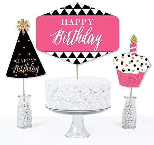 Big Dot of Happiness Chic Happy Birthday – Pink, Black and Gold – Birthday Party Centerpiece Sticks – Table Toppers – Set of 15