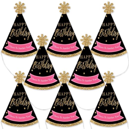 Big Dot of Happiness Chic Happy Birthday – Pink, Black and Gold – Mini Cone Birthday Party Hats – Small Little Party Hats – Set of 8