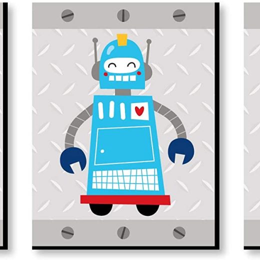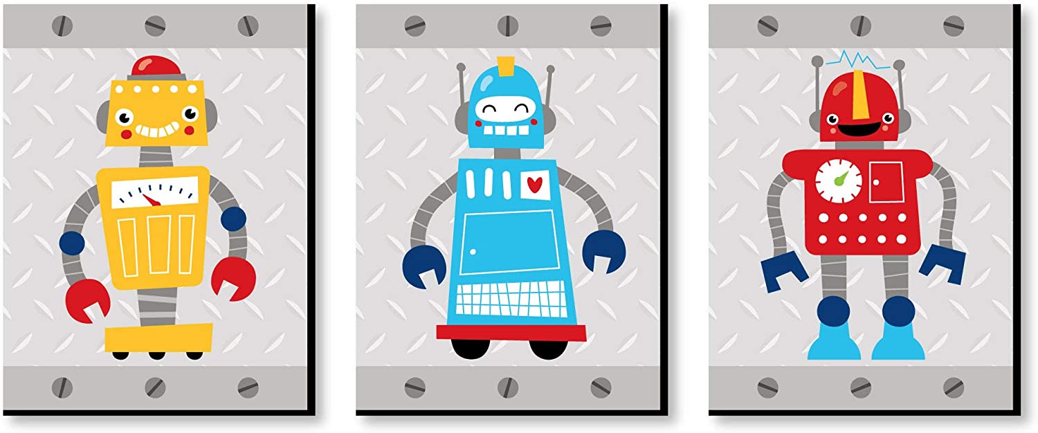 Big Dot of Happiness Gear Up Robots – Nursery Wall Art and Kids Room Decor – 7.5 x 10 inches – Set of 3 Prints