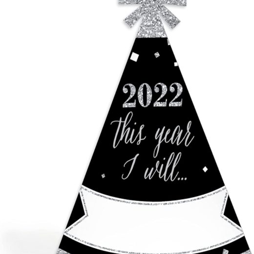 Big Dot of Happiness New Years Eve – Silver – 2022 Cone New Years Eve Resolution Party Hats for Kids and Adults – Set of 8 (Standard Size)