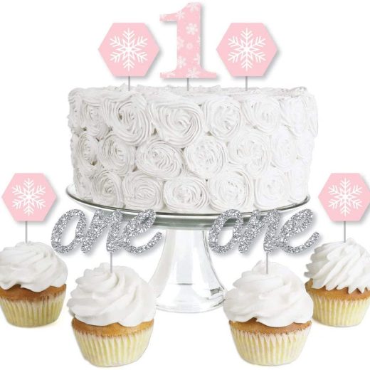 Big Dot of Happiness Pink Onederland- Dessert Cupcake Toppers – Holiday Snowflake Winter Wonderland Birthday Party Clear Treat Picks – Set of 24