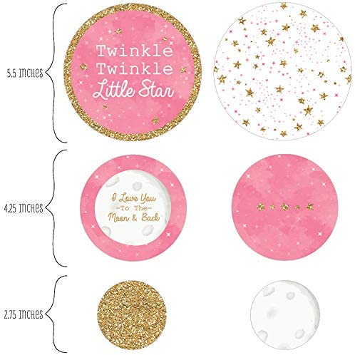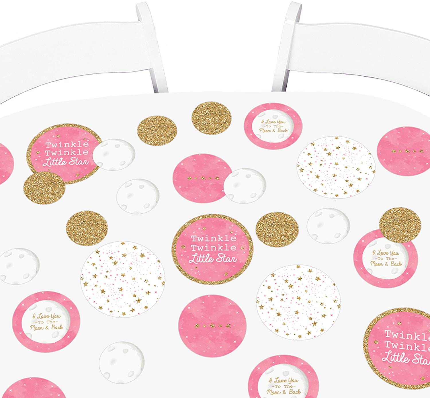 Pink Twinkle Twinkle Little Star Giant Circle Confetti INCLUDES 27 large baby shower or birthday party confetti. Pink Twinkle Twinkle Little Star party decorations are perfect for a little star party. Pink Twinkle Twinkle Little Star giant circle confetti SIZE 5.5 inches large circles, six qty; 4.25 inches medium circles, nine qty; and 2.75 inches small circles, twelve qty. The unique design and large size makes these pink and gold party decorations an impressive addition to any baby shower or birthday party. EASY TABLE DECOR: Pink Twinkle Twinkle Little Star giant circle confetti comes in a variety of coordinating patterns in three different sizes. Scatter them down the length of your party tables, add them to centerpieces or hole-punch them and string together as a baby shower or birthday party banner. Pink twinkle paper confetti pieces will make a statement however you choose to use them. PREMIUM PARTY SUPPLIES: Pink Twinkle Twinkle Little Star giant circle confetti are professionally printed on heavy-duty cardstock paper with a photo-like shine. They individually inspected and carefully packaged by hand. Giant table confetti will arrive flat. Get creative with your DIY party ideas! MADE IN THE USA: Pink Twinkle Twinkle Little Star – Party Giant Circle Confetti is designed and manufactured at our Wisconsin facility using materials that are Made in America. Pink Twinkle Twinkle Little Star Table Confetti use a No-Mess Glitter Print: Our confetti are designed with a printed image of glitter, eliminating glitter flake while maximizing bling effect!