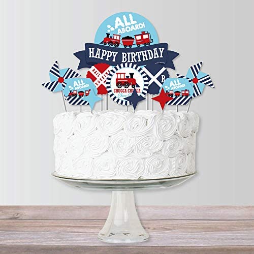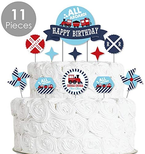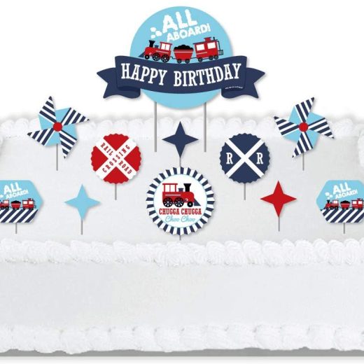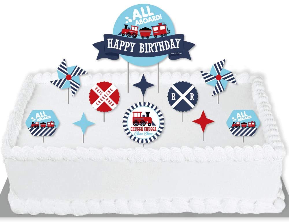Big Dot of Happiness Railroad Party Crossing – Steam Train Birthday Party Cake Decorating Kit – Happy Birthday Cake Topper Set – 11 Pieces