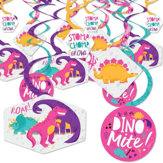Big Dot of Happiness Roar Dinosaur Girl – Dino Mite Trex Baby Shower or Birthday Party Hanging Decor – Party Decoration Swirls – Set of 40