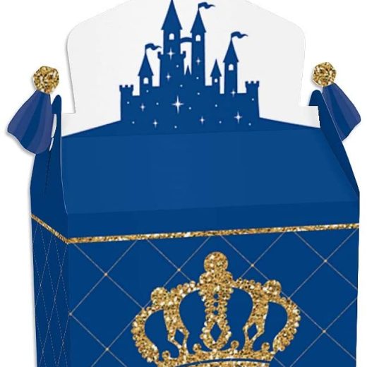 Gable Boxes INCLUDE: 12 Royal Prince Charming-themed goodie party favor boxes. Each box SIZE measures 4.25 inches length x 3 inches width x 7.75 inches height. Gable favor boxes are ideal for small gifts and treats that are under 3.5 inches tall (height for storing items in closed box). FUN PARTY FAVORS: Use gable boxes for a unique party gift at any celebration party. This small, closed favor box can be filled with baked goodies, party trinkets, or thank you gifts. Party guests will have fun with the mystery of what each party loot box will contain. PREMIUM PARTY SUPPLY: Gable treat boxes are professionally printed and double-sided on heavy-duty cardstock paper, with a photo-like shine. They are hand-folded, individually inspected, and then carefully packaged. SIMPLE ASSEMBLY: Royal Prince Charming gable boxes will arrive flat. Allow time for the required assembly of each box. Gable boxes have crease lines and numbered tabs for easy folding. Packaging will include assembly instructions. MADE IN THE USA: Royal Prince Charming Baby Shower or Birthday Party goodie gable boxes are designed and manufactured at our Wisconsin facility using materials that are Made in the USA. Royal Prince Charming goodie gable boxes use a No-Mess Glitter Print: Our DIY party decorations are designed with a printed image of glitter, eliminating glitter flake while maximizing bling effect!