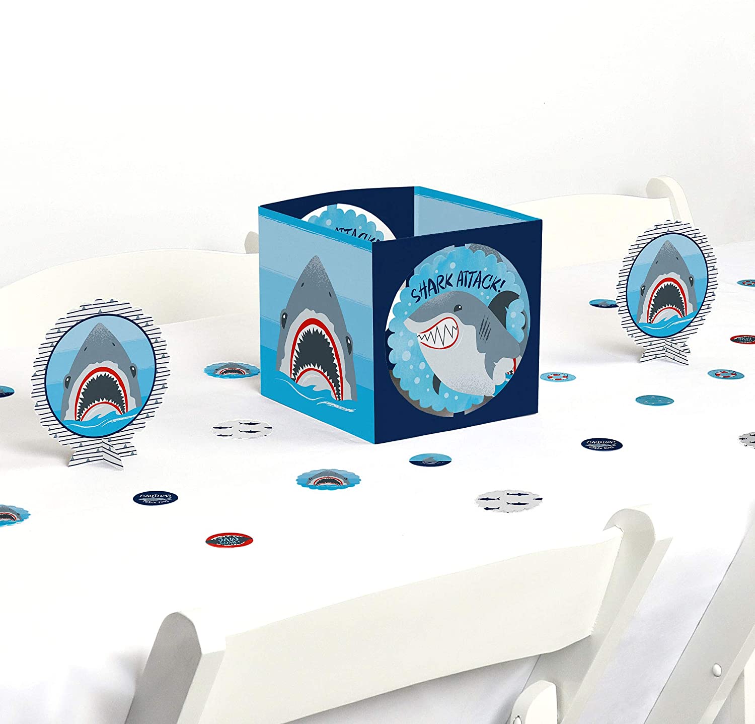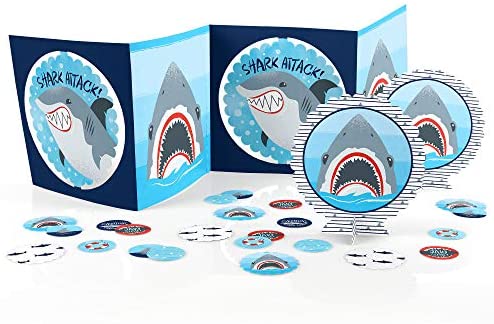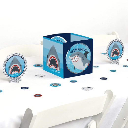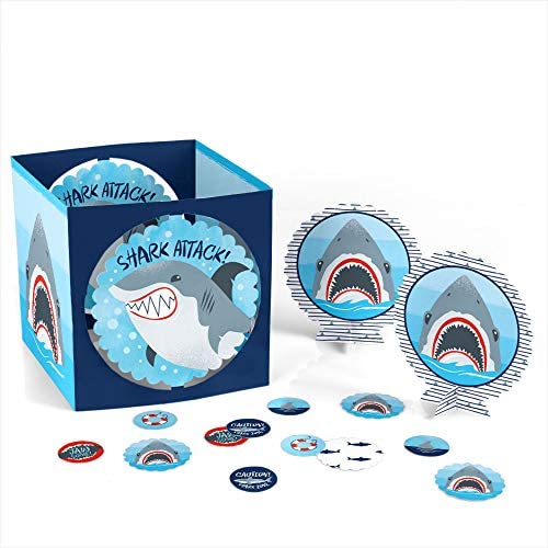 Shark Zone Table Decoration Kit INCLUDES 1 large shark week centerpiece, 2 scalloped centerpieces, 12 scalloped table confetti pieces and 24 round …