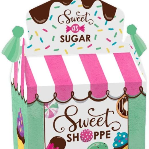 Gable Boxes INCLUDE: 12 Sweet Shoppe-themed goodie party favor boxes. Each box SIZE measures 4.25 inches length x 3 inches width x 7.75 inches heig…