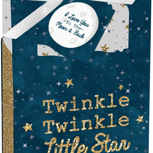 Twinkle Twinkle Little Star Favor Boxes INCLUDES 12 navy blue and gold stars party favor bags, 12 gift tags and coordinating satin ribbon. Classic favor boxes are a party must-have. Moon and star theme party supplies are great for a baby shower or birthday party. Twinkle Twinkle Little Star Party Favor Boxes SIZE 4.75 inches wide x 4.75 inches high x 2.25 inches deep (fillable inside space) with a total height of 7 inches, including the handle. The coordinating gift tags and ribbon makes these moon and star party favor boxes a complete treat bag party kit that everyone will love. PARTY SUPPLIES: Baby shower or birthday party favor boxes will hold a variety of treats, prizes and party favors for your guests. Fill them with baked goodies, party trinkets or thank you gifts for adorable little star party favors! PREMIUM PARTY FAVOR BOXES: Twinkle Twinkle Little Star party favor boxes are professionally printed on heavy-duty cardstock paper with a photo-like shine. They are hand-folded and individually inspected, then carefully packaged. Favor boxes will arrive flat, partially assembled. Finishing assembly is required but it is easy. Once assembled, add the “I love you to the moon and back” gift tag with the included ribbon for perfect party favors! MADE IN AMERICA: Twinkle Twinkle Little Star – Baby Shower or Birthday Party Favor Boxes are designed and manufactured at our Wisconsin facility using materials that are Made in America. Twinkle Twinkle Little Star Favor Boxes use a No-Mess Glitter Print: Our favor boxes are designed with a printed image of glitter, eliminating glitter flake while maximizing bling effect!
