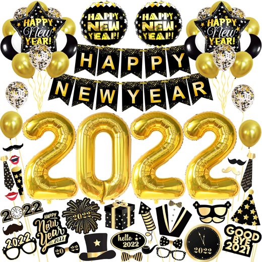 HUGE PACK OF 76 | COMPLETE NEW YEAR DECORATIONS 2022 KIT : Thinking of a shimmering and beautiful new years eve party supplies 2022 This luxurious color combination of Black and Gold Happy New Years Banner, Gold 2022 balloons with black, gold and confetti latex balloons new years eve backdrop and 2022 photo booth props for new years eve decoration will be the eye-catcher of the event. Perfect for celebrations like new years eve decorations. 10 FEET HAPPY NEW YEAR BANNER WITH 2022 GOLD BALLOONS AND PROPS, FOIL BALLOONS SET – An affordable, complete new years decorations Look no more! This black and gold New years eve party supplies kit comes with an elegant 10 Feet Happy New Year Banner 2022 , 40 Inch Gold 2022 Balloon, pack of 32 gold, black, white latex balloon, Confetti balloons & a gold and black New year foil balloons and pack of 35 new year photo props .Everything you need to complete new years eve party decorations 2022! BUY WITH CONFIDENCE l 100% SATISFACTION GUARANTEE – Customer satisfaction is our main objective, so we personally made sure that the materials we used for happy new year decorations 2022 is a Grade A Quality. We will make sure that what you saw on the picture is what you will get on your door. If you are not satisfied with our happy new year balloons, we guarantee to give you 100% full money for this new years eve decor. Place your order now! MULTI-PURPOSE & REUSABLE NYE DECORATIONS 2022 SET – Want to have a New Years Eve party decorations backdrop that lasts long Made from thick Cardstock this black and gold Happy New Year banner 2022, new years eve props have the sturdiness like no other. It can be reused for the next year’s event. Easy to attach and detach. Balloons are made of premium quality latex and foil which is healthy and safe. PICTURE-PERFECT BACKDROP | ELEGANT SIMPLE TO USE NEW YEAR PARTY FAVORS – This happy new year 2022 kit is totally picture-perfect décor for New Year. With a beautiful and attractive black and gold banner will make your party shine and glitter with sophistication. Easy to hang and detach! Glam up your backdrop and centerpiece with this beautiful black & gold theme party favors. What are you waiting for Place your order now!