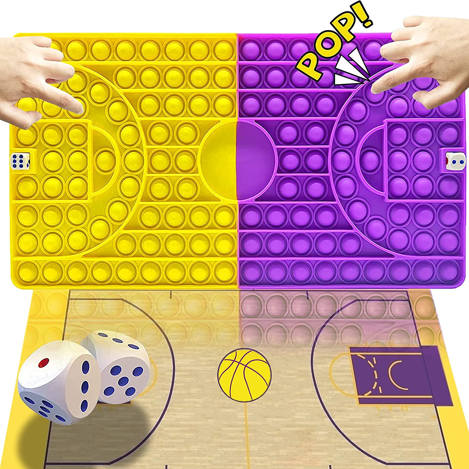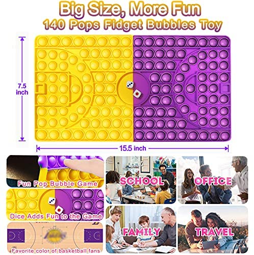 Why Choose Our UrPalpitate Giant Pop Fidget ToyOur pop fidget game toys are not only suitable for children as a good holiday gift to make them funny,keep them away from electronic games and TV.Also a good choice for adults. It can help relieve stress, exercise childrens logical thinking ability.Why Choose Our UrPalpitate Giant Pop Fidget ToyWe focus on the real needs of children and young people in order to sell the hottest, best quality, most fun toys.We dont just sell whats hot, we sell what the kids really need.Feature:The fidget popper has jumbo sized but is Lightweight, which can be taken and played anywhere.Huge Pop Fidget Toy is made of silicone material with excellent craftsmanship, and could be reused and cleaned for a long time.Easily pop out and pop loudly at both sides.A new way to play Pop Bubble Fidget Sensory Toy.The new Jumbo Pop Bubble Fidget Toy mobilizes your emotions and can bring greater fun to your party.It can help relieve stress, exercise childrens logical thinking ability. Keep them away from electronic games and TV.Play it with your children, friends, family, etc.Specification:1 Material: Silicone2 Shape: Basketball Court3 Size: 15.5 x 7.5 inchHow to play with dice: Just roll the dice and press the bubbles in turn. Who press the last will lose one round. After pressing all the bubbles, you can flip the chessboard and quickly to start a new round. Make more game rules to make the game more exciting. Lets play together,endless battle,endless fun.How to play without dice:Players take turns pressing down any number of pop they wish in a single rowThe player who presses down the last pop loses the roundWho