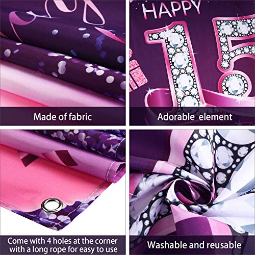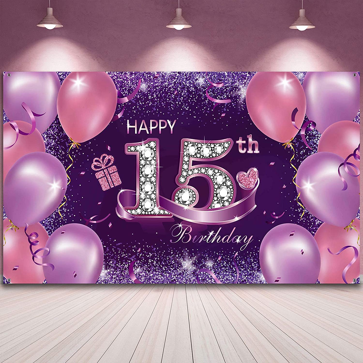 Birthday Backdrop Banner Happy 15th Birthday Photo Booth Backdrop Pink and Purple Banner Sign Poster Party Decorations Extra Large Birthday Photo Background for Party, 72.8 x 43.3 Inch