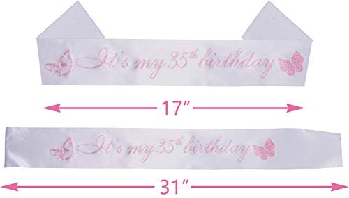 At The 35 TH Birthday Kit Includes: 35th Pink Rhinestone Tiara Crown and White SAS H Its My 35th Birthday Sparkling 35th birthday tiara crown: 100% eco-friendly crystals and rhinestones, nickel free and anti-allergic Tiara size: 5.12 on the front side. The size of number 35 is: 1.57 x 1.57 Its my 35th birthday quality satin sash: made of quality material with nice silky feel, size approximately 27- 32 and 3.10 wide. One size fits all DoraDreamDeko is a registered trademark in US PATENT AND TRADEMARK OFFICE (Serial Number 88231418 ). 100% GUARANTEED: Please contact us if you are not satisfied with our products. We promise to give you a full refund